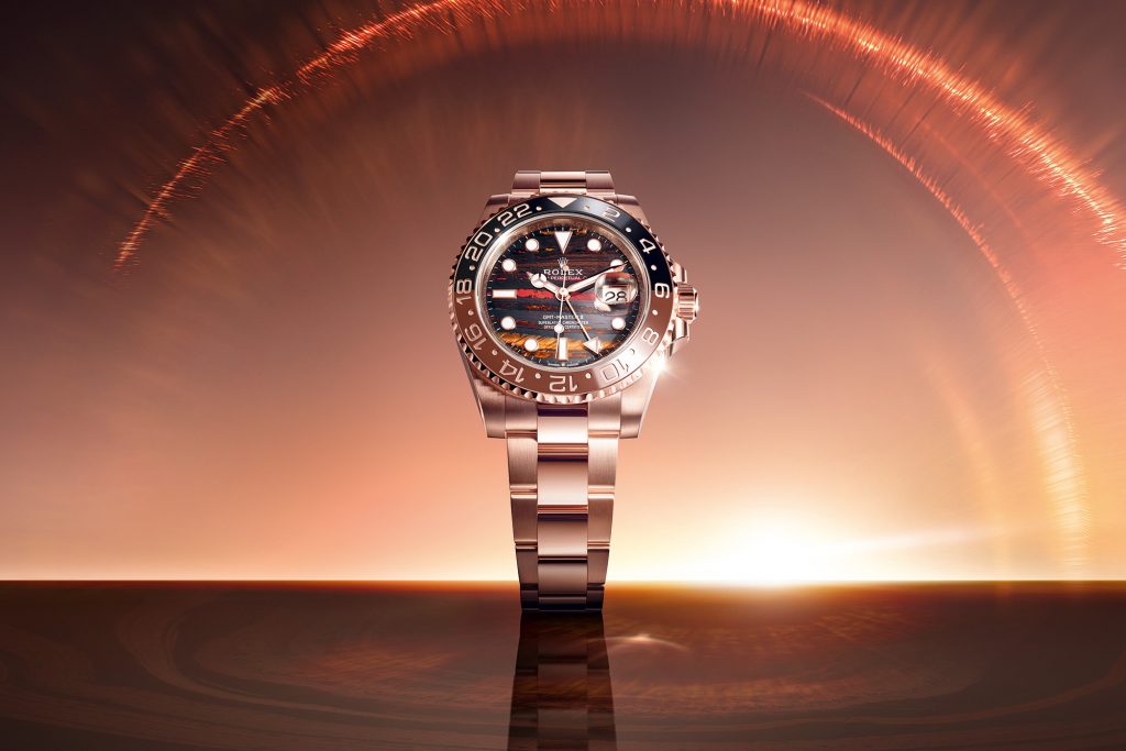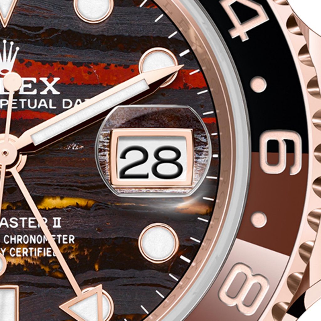 Aunque Rolex ya ofrecía el GMT-Master II en los tres tonos de oro de 18 quilates, solo la versión «Pepsi» en oro blanco estaba disponible con más de una opción de esfera. Las replicas de lujo vintage del GMT-Master II en oro amarillo y bicolor se pueden encontrar con esferas negras o marrones, pero en la era moderna del bisel cerámico (es decir, los últimos 20 años), todos los modelos de oro amarillo y oro Everose se equiparon exclusivamente con esferas negras. Sin embargo, entre sus últimos lanzamientos, presentados este año en Watches & Wonders Ginebra 2025, se encuentra una nueva configuración para el modelo «Root Beer» en oro Everose, y la nueva replica de lujo del Rolex GMT-Master II 126715CHNR amplía la referencia existente con una esfera de piedra tallada a partir de una lámina de hierro de tigre.