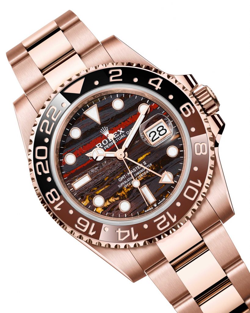 A todos los efectos, la nueva replica de lujo económica de hierro de tigre Rolex GMT-Master II 126715CHNR «Root Beer» es esencialmente una variación de la esfera del modelo existente de oro Everose, que reemplaza la esfera negra estándar por una elaborada a partir de una pieza de hierro de tigre natural. Para quienes no estén familiarizados con esta piedra semipreciosa, el hierro de tigre es una roca metamórfica compuesta de ojo de tigre, jaspe rojo y hematita plateada, y el nuevo GMT-Master II representa la primera vez que esta piedra aparece en el catálogo de Rolex. Los tres minerales diferentes crean un patrón lineal distintivo en toda su superficie (similar al ojo de tigre) que muestra tonos naranja dorados con destellos rojos que recorren su composición, y ofrece una apariencia notablemente más dinámica que los tonos monocromáticos del ojo de tigre.